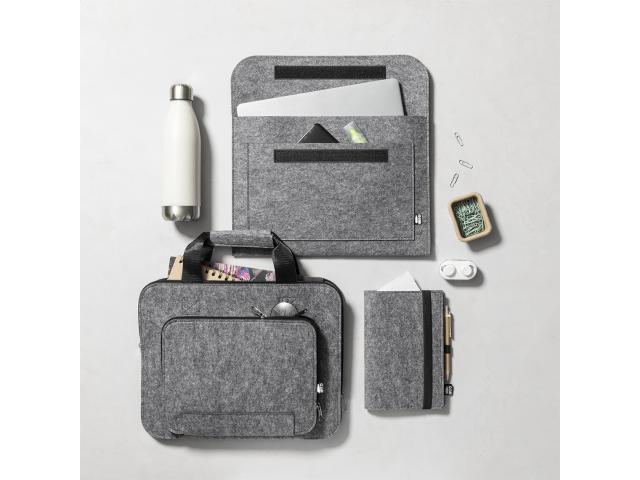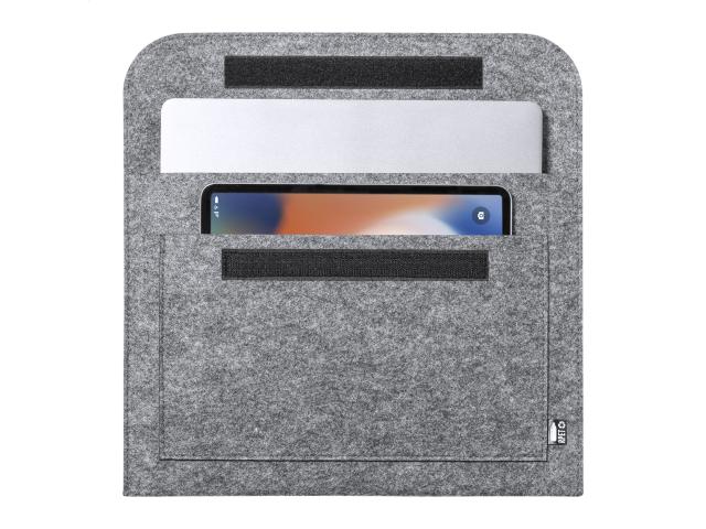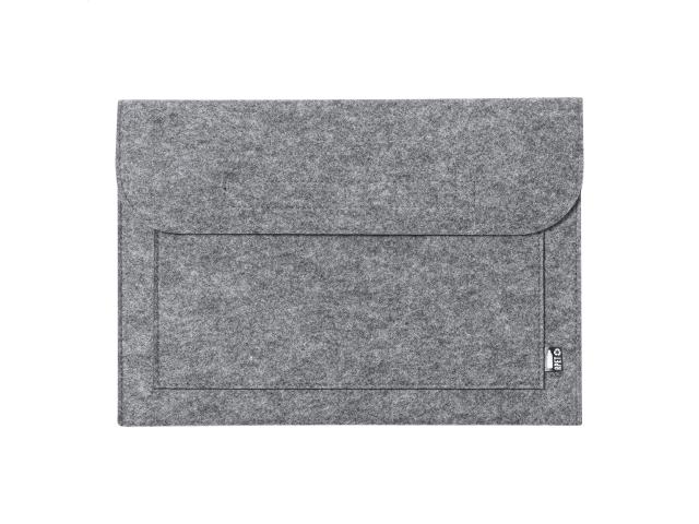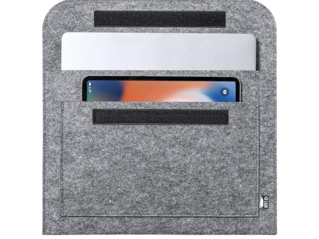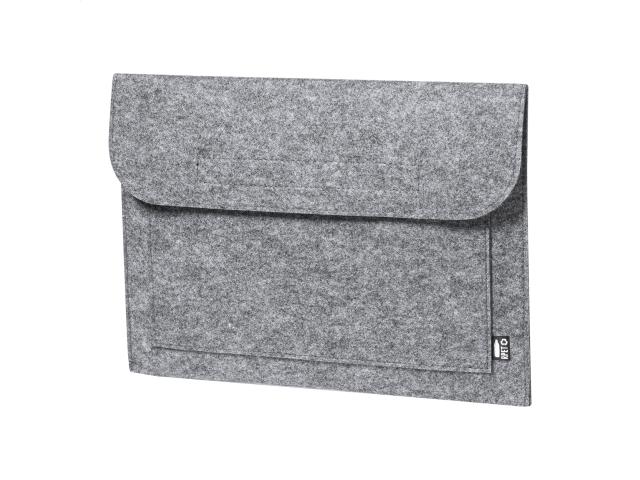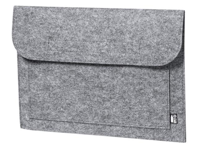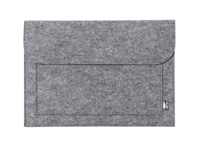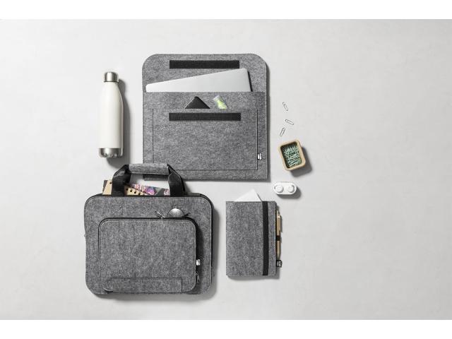 RPET felt laptop pouch with front pocket and velcro closure. With distinctive RPET label.