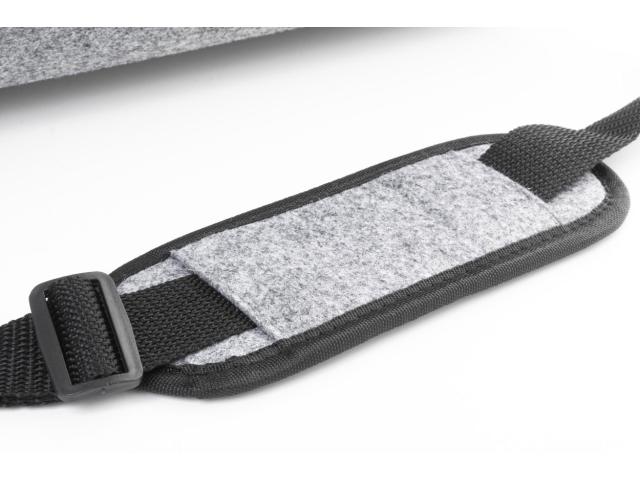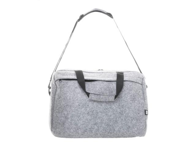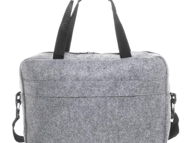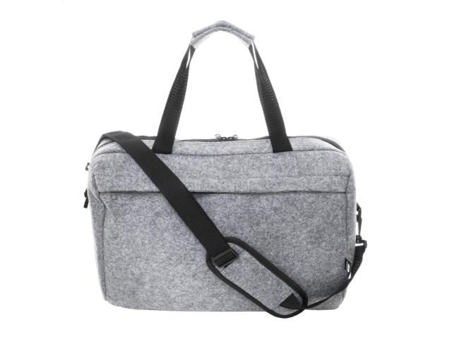RPET felt document bag with zipped main compartment and front pocket. With laptop (15") compartment, trolley strap and adjustable shoulder strap. With distinctive RPET label.