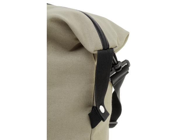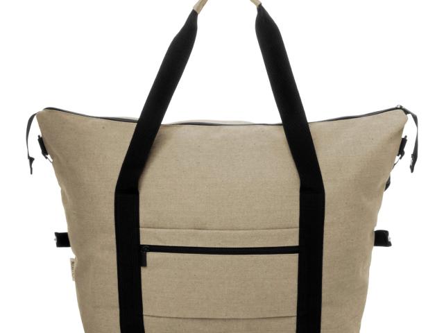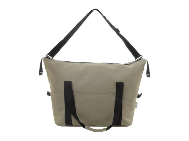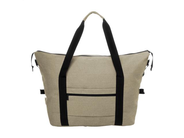 Recycled canvas travel / sports bag with zipped main compartment, front pocket, adjustable shoulder strap and zipped back pocket which doubles as trolley strap. 70% recycled cotton and 30% RPET polyester. With distinctive recycled cotton label.