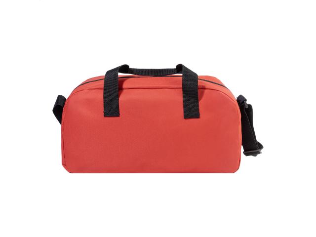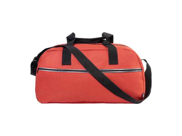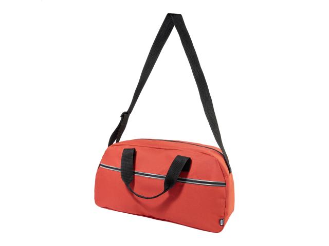RPET sports bag with zipped main compartment, zipped front pocket with reflective strips, and adjustable shoulder strap. 600D RPET polyester, with distinctive RPET label.