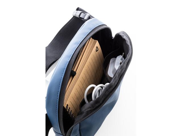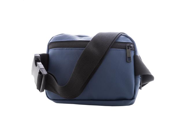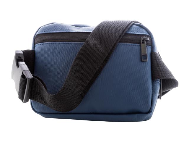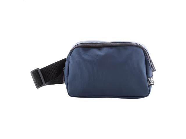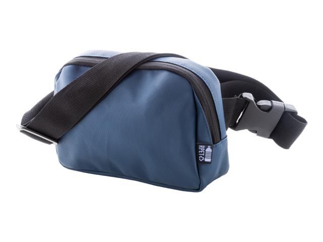 Waterproof RPET waist bag with 2 zipped compartments, mesh inside organizer pockets and adjustable strap. PU coated 600D RPET polyester, with distinctive RPET label.