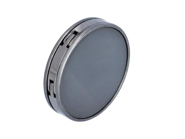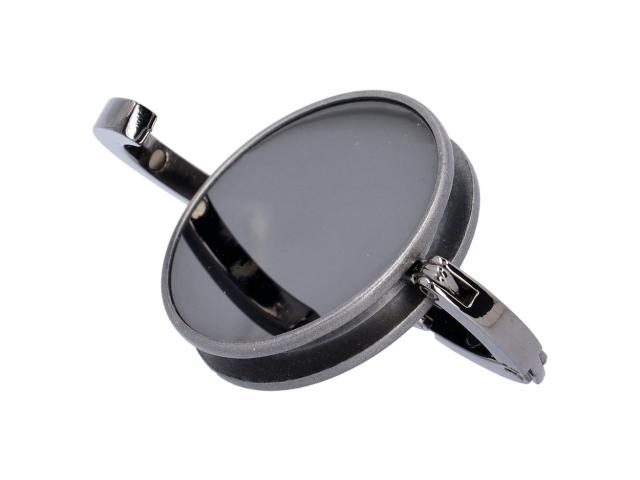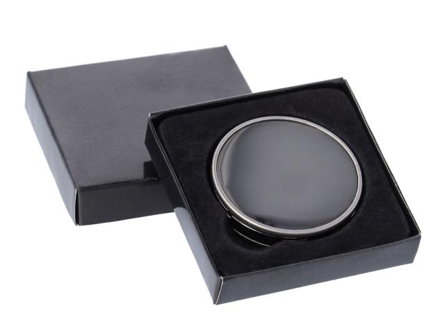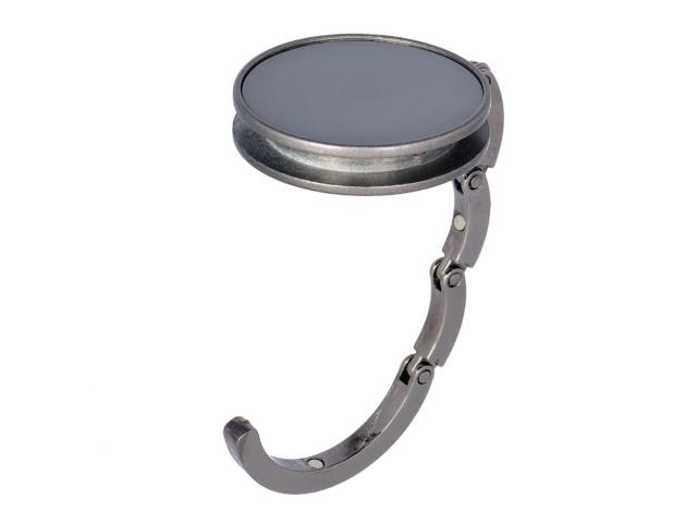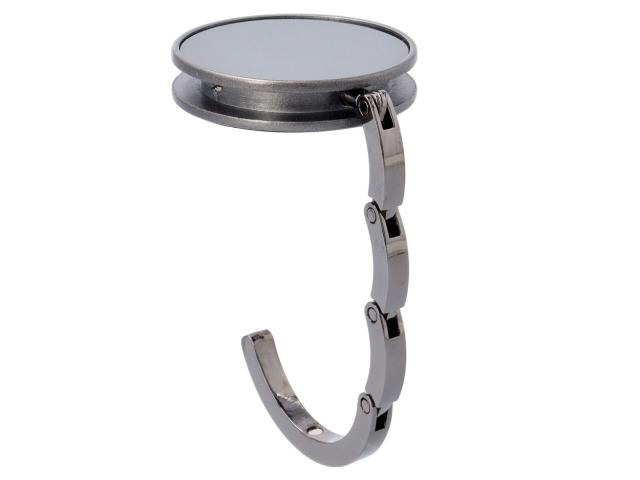 Metal bag hanger with gunmetal finish and shiny plate. With magnetic closure. Delivered in black paper box.