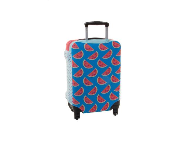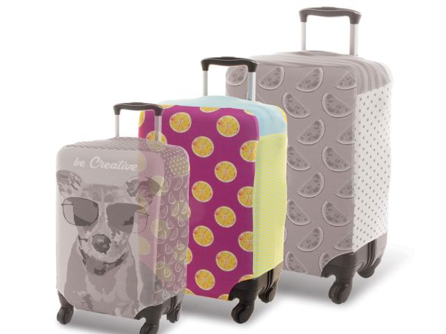 Custom made, polyester luggage cover with velcro closure. Fits medium sized suitcases up to 42x62x26 cm. With all over sublimation printed graphics. MOQ: 25 pcs.