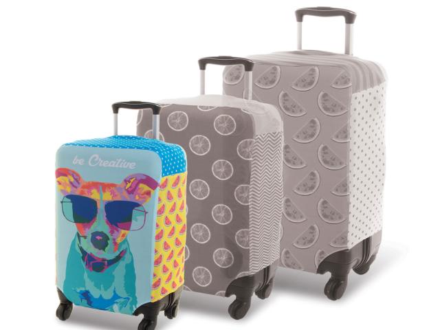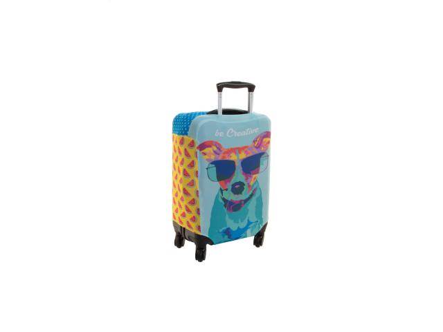 Custom made, polyester luggage cover with velcro closure. Fits small sized suitcases up to 34x52x24 cm. With all over sublimation printed graphics. MOQ: 25 pcs.