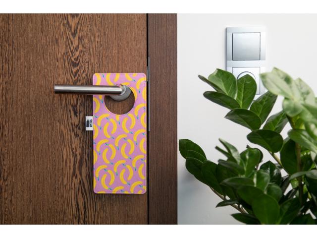 Custom made, RPET felt door hanger with full colour printed front side and distinctive RPET label. Price includes sublimation printing. MOQ: 50 pcs