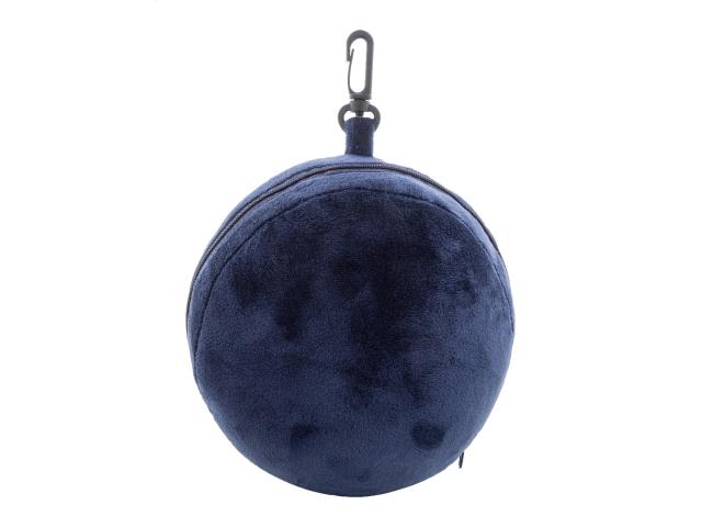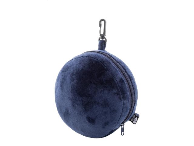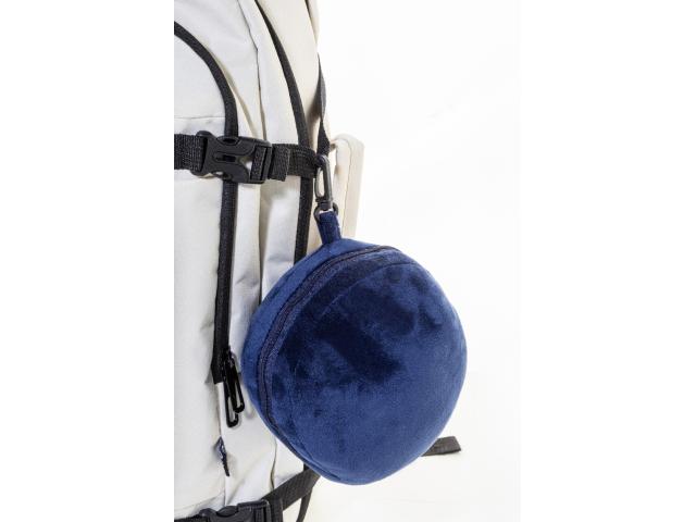 RPET polyester travel pillow with integrated eye mask featuring elastic straps. Zips into a compact ball shape for easy storage and includes a PP carabiner for attaching to luggage. With distinctive RPET label.