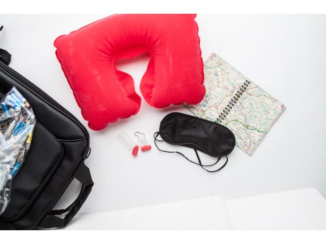Travel set with inflatable travel pillow, eye mask and earplugs. Delivered in matching colour velvet case.