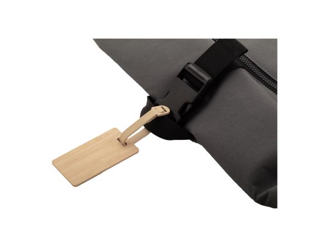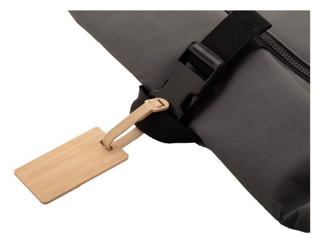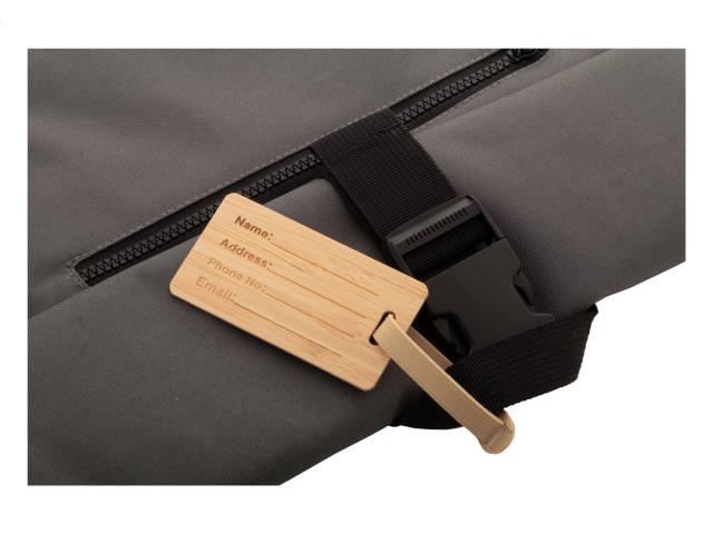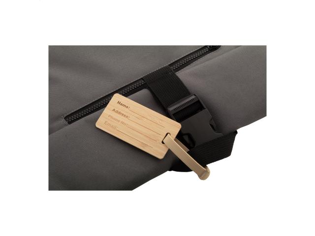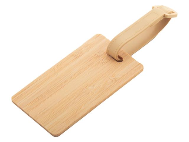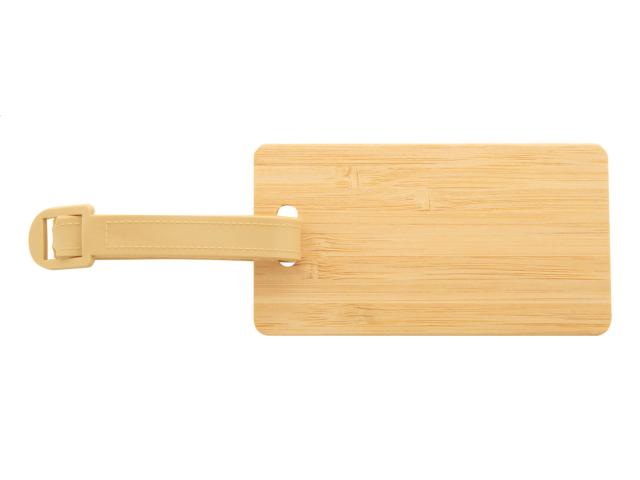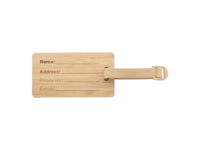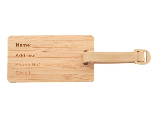 Bamboo luggage tag with plastic strap and buckle.