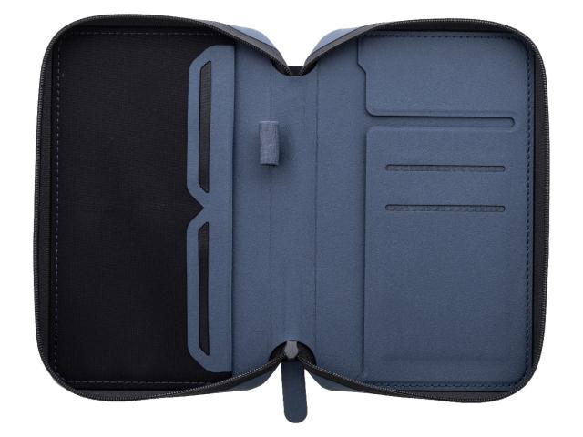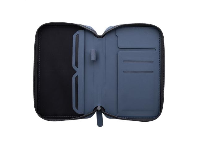 Zipped luxury travel organizer and passport case in recycled PU leather. Featuring multiple interior pockets for documents, cards, and travel essentials.