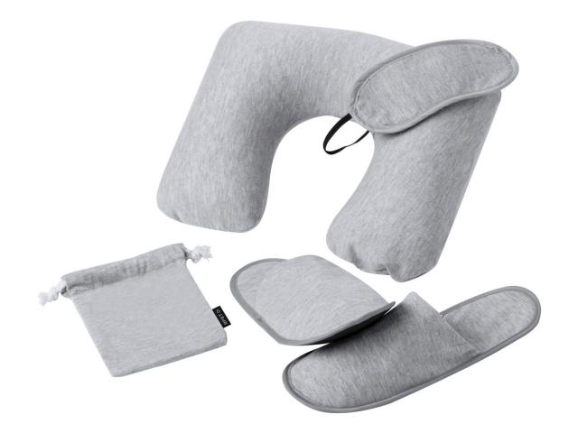RPET polyester travel set in drawstring pouch. Including inflatable travel pillow, eye mask and slippers in one size (36-43).