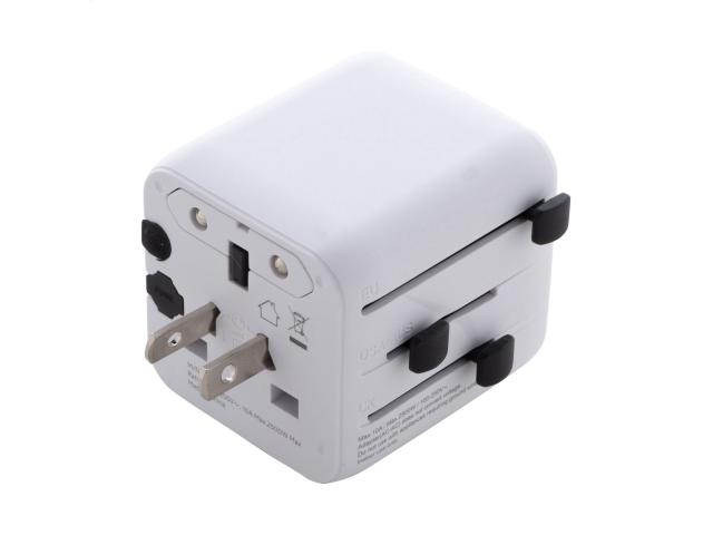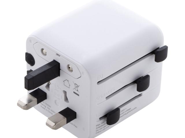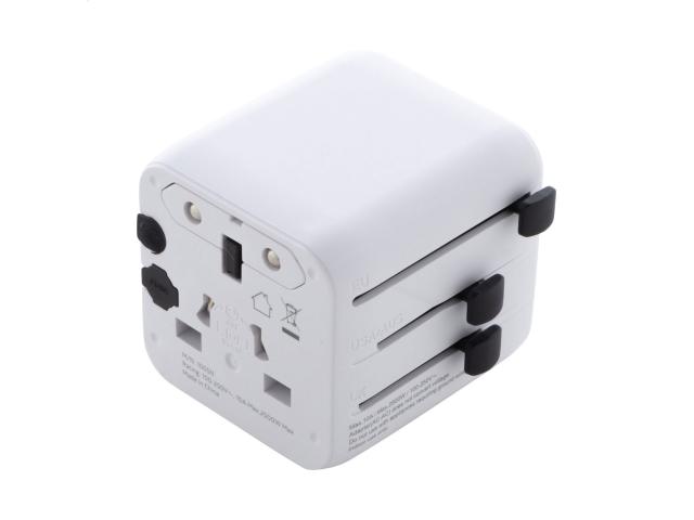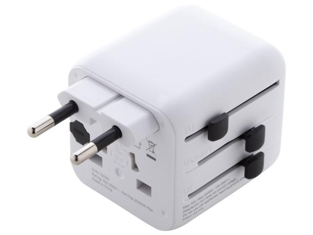 Ultra compact, universal world-wide travel adapter in recycled PC plastic, with built-in wall plugs for USA, Europe, UK and Australia.