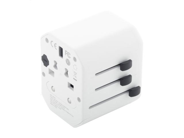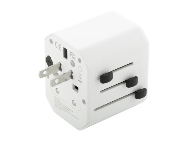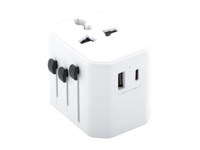 Universal world-wide travel adapter in ABS plastic, with built-in wall plugs for USA, Europe, UK and Australia. With 1 USB and 1 USB-C charger ports.