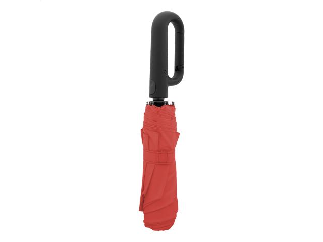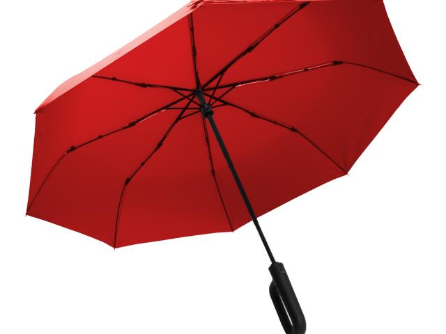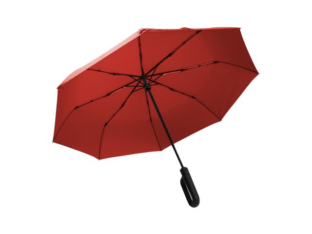Full automatic (open/close), windproof folding umbrella with 8 panels in matching colour pouch. With metal frame, fibreglass ribs and rubberized carabiner loop handle. 190T RPET pongee. With distinctive RPET label.