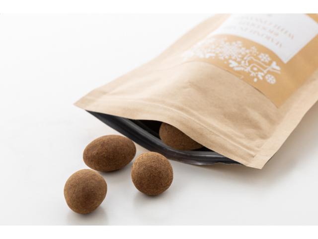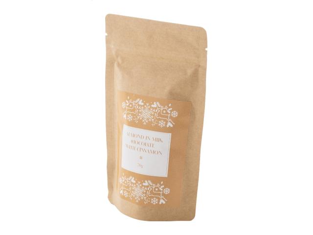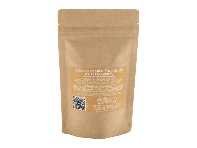 Milk chocolate and cinnamon coated almonds in a natural kraft paper bag. 70 grams.