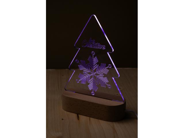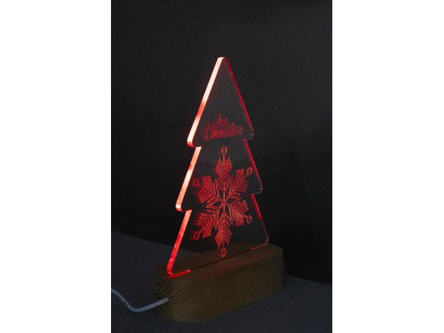 Custom made, Christmas tree-shaped acrylic trophy on wooden base with USB powered multicolour LED light. With USB charger cable. Price includes engraving of the acrylic Christmas tree. MOQ: 25 pcs.