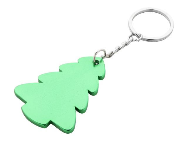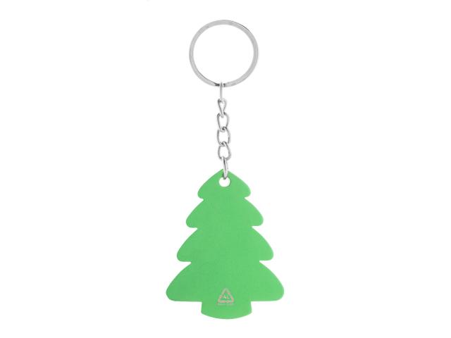 Christmas tree shaped recycled aluminium keyring with metal ring.