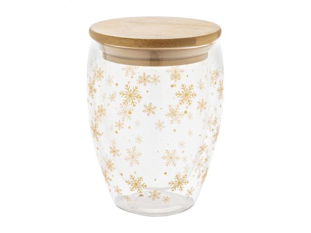 Double-wall, borosilicate glass thermo cup with Christmas snowflake design and bamboo lid, 310 ml. In kraft paper box.