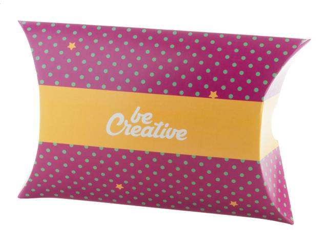 Custom made, full colour printed paperboard pillow box. Delivered flat-packed. MOQ: 50 pcs.