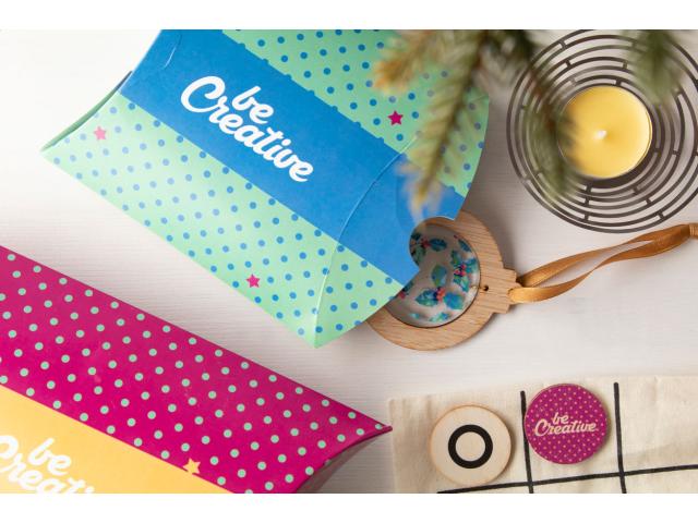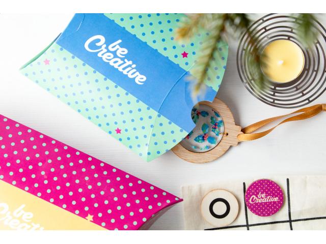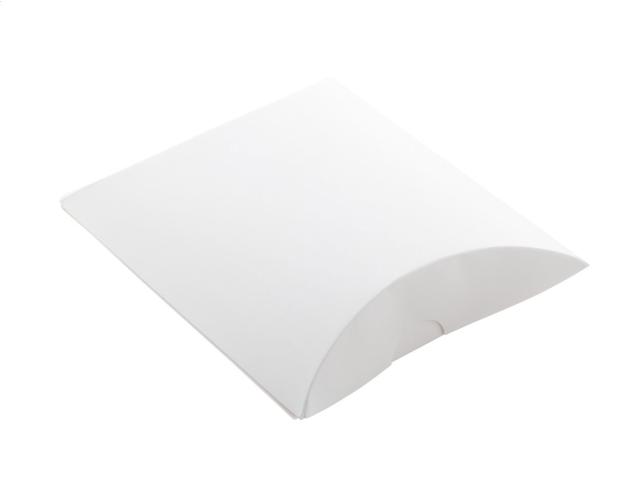 Custom made, full colour printed paperboard pillow box. Delivered flat-packed. MOQ: 50 pcs.