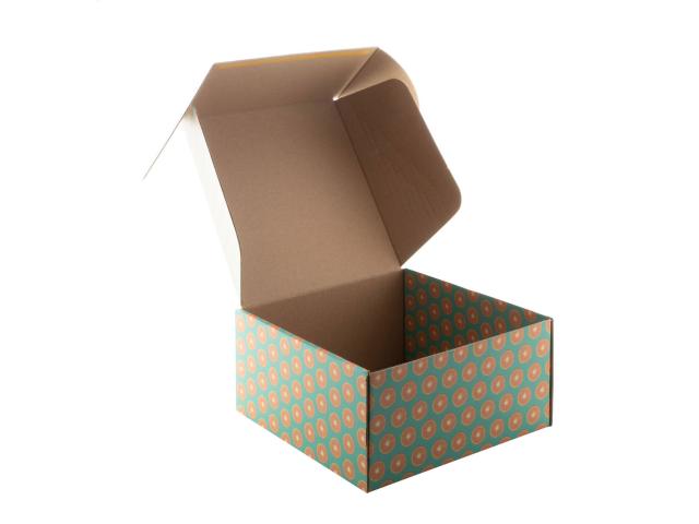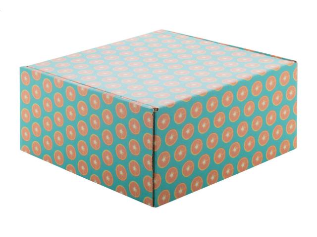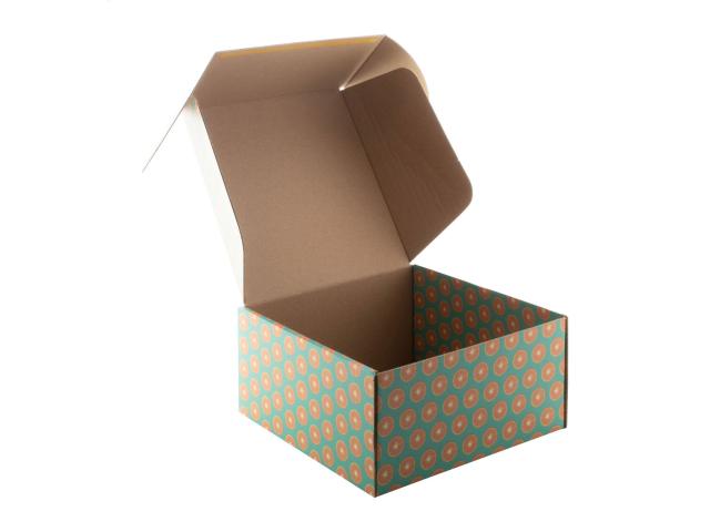 Custom made, full colour printed corrugated cardboard, square based postal gift box with self-sealing strip. Delivered flat-packed. MOQ: 50 pcs.