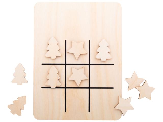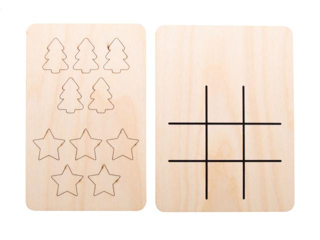 Christmas design tic-tac-toe game in birch plywood with 10 tokens and game board.