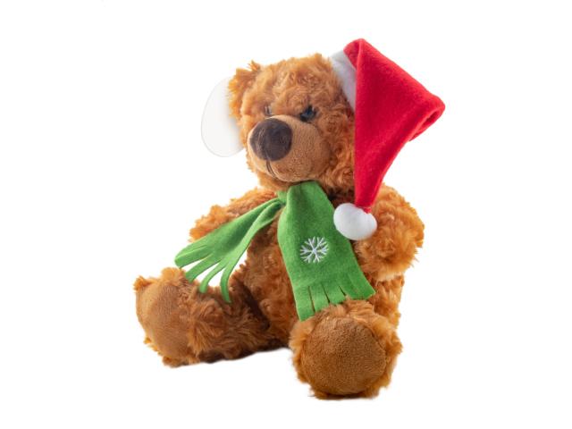 Plush Christmas teddy bear with Santa hat and scarf. With printable paper hang tag on its ear.