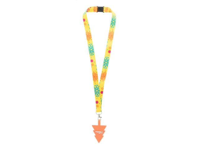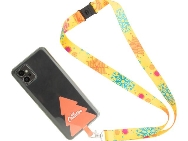 Custom made, RPET mobile holder lanyard with metal carabiner, safety buckle and full colour printed Christmas tree shaped phone insert in tearproof paper. With sublimation printed graphics on both sides. MOQ: 100 pcs.