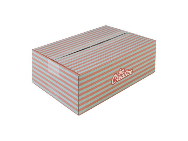 Custom made, full colour printed corrugated cardboard shipping box. Delivered flat-packed, top and bottom must be taped for use. MOQ: 50 pcs.