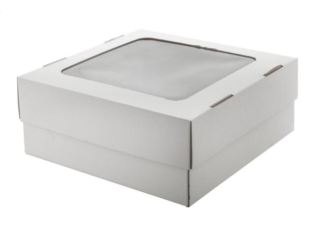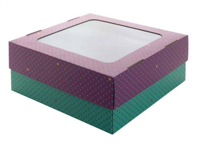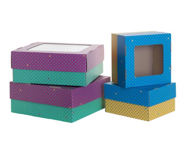 Custom made, full colour printed corrugated cardboard lid-bottom box with window. Delivered flat-packed. MOQ: 50 pcs.