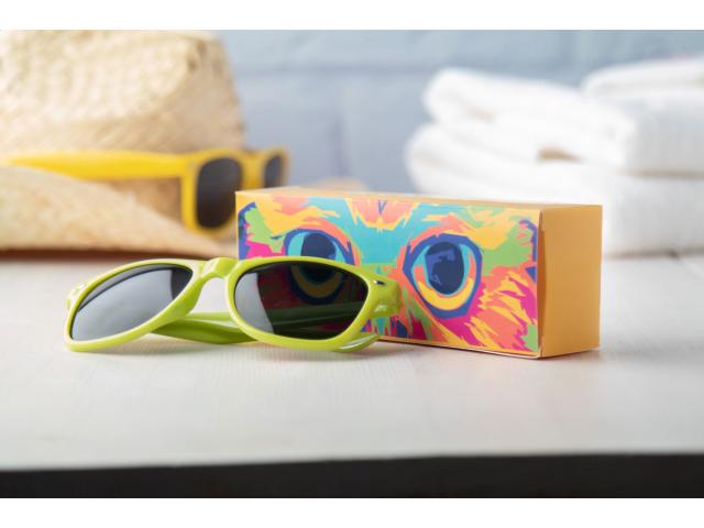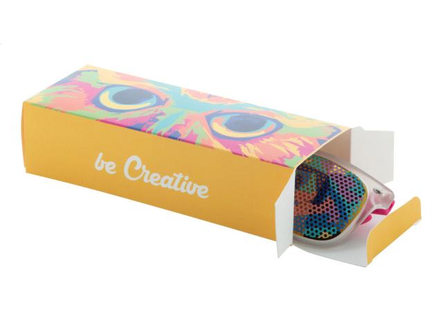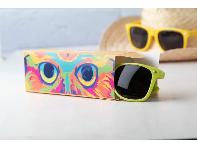 Custom made, full colour printed paperboard box for sunglasses. If the custom box is purchased without the matching product, it will be delivered flat-packed (requiring assembly). MOQ: 50 pcs.