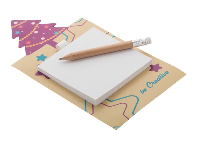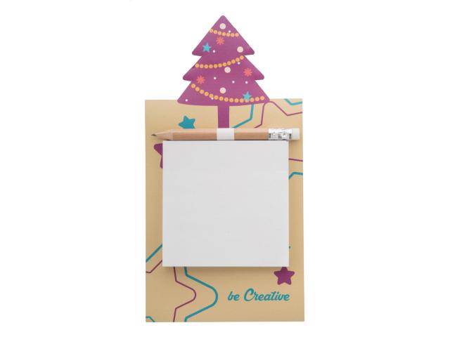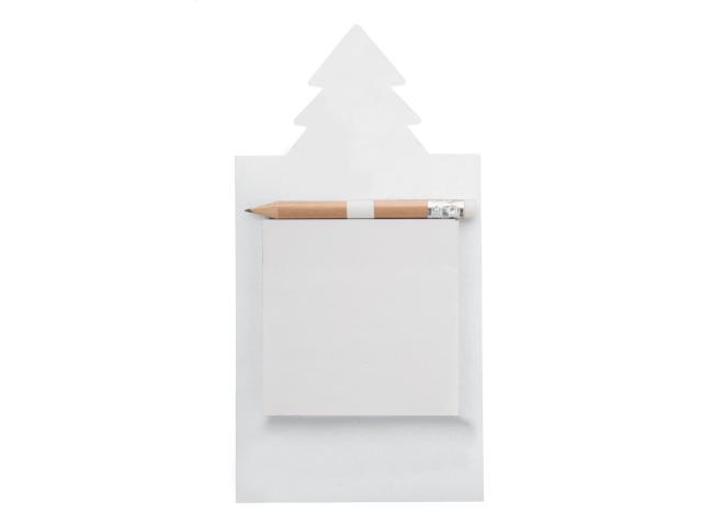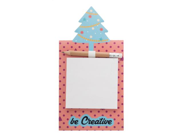 Custom made, full colour printed fridge magnet with Christmas tree decoration, sticky notepad and mini wooden pencil. Includes 50 sheets of recycled paper sticky notes (75×75 mm). MOQ: 100 pcs.