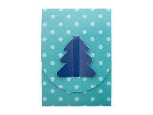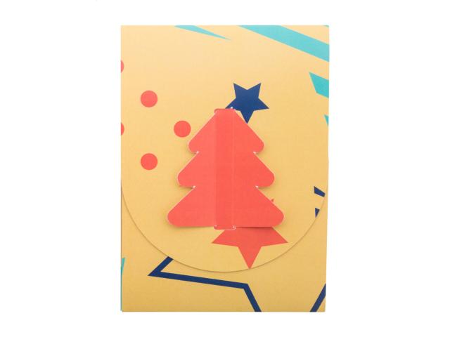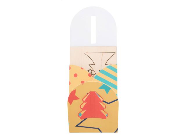 Custom made, foldable paper Christmas card with custom graphics and die-cut Christmas tree shape on the cover, including wooden Christmas tree shaped craft puzzle. Including C6 postal envelope. MOQ: 100 pcs.