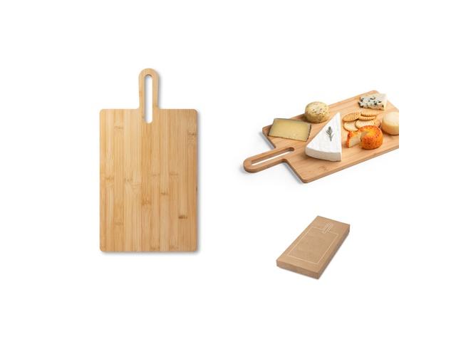 Velika daska za posluživanje od bambusa s ručkom, svestrana. Isporučuje se s kraft poklon kutijom.Budući da je proizvod izrađen od prirodnih materijala, boja te rezultat ispisa mogu se razlikovati od proizvoda do proizvoda. 450 x 240 x 12 mm