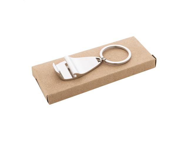 Metal bottle opener keyring. In kraft paper box.