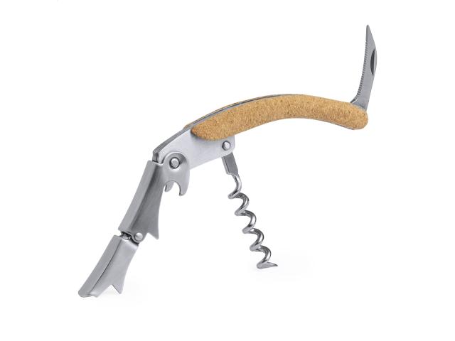 Stainless steel bottle opener and corkscrew with natural cork handle.