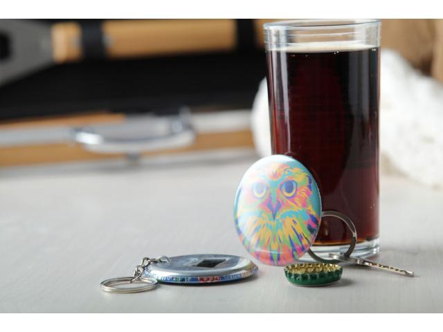 Pin button bottle opener and fridge magnet with custom full colour paper insert. Price includes digital printing. MOQ: 100 pcs.