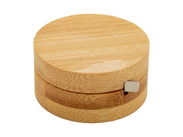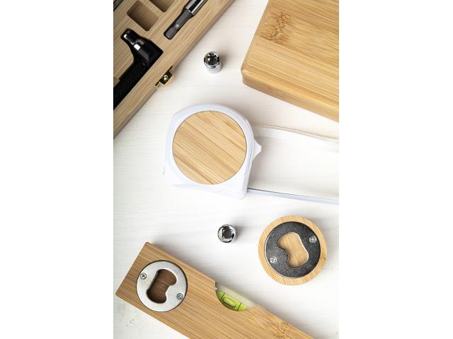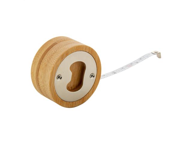Round bamboo bottle opener with 1 m tape measure.
