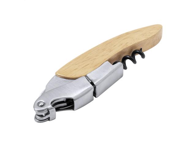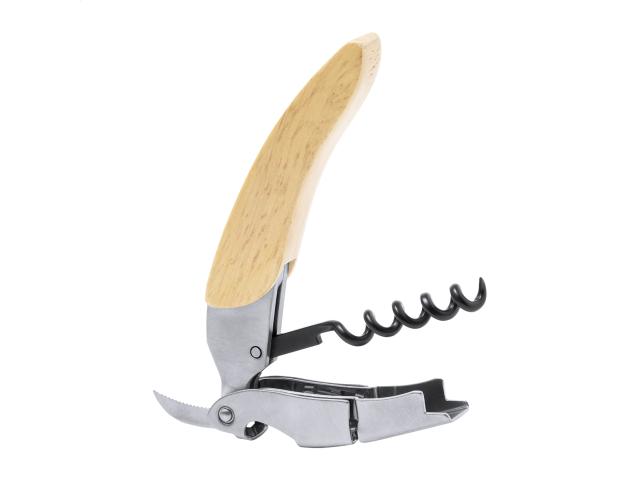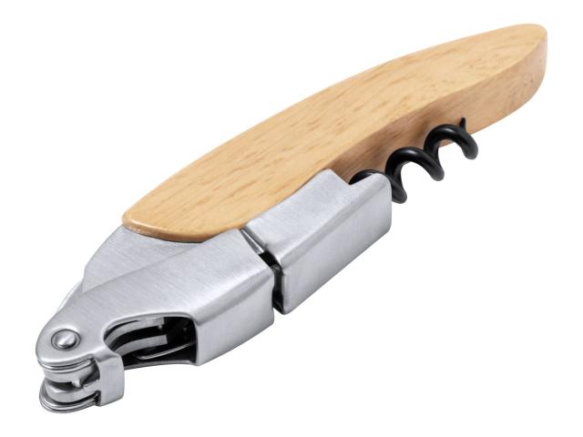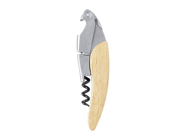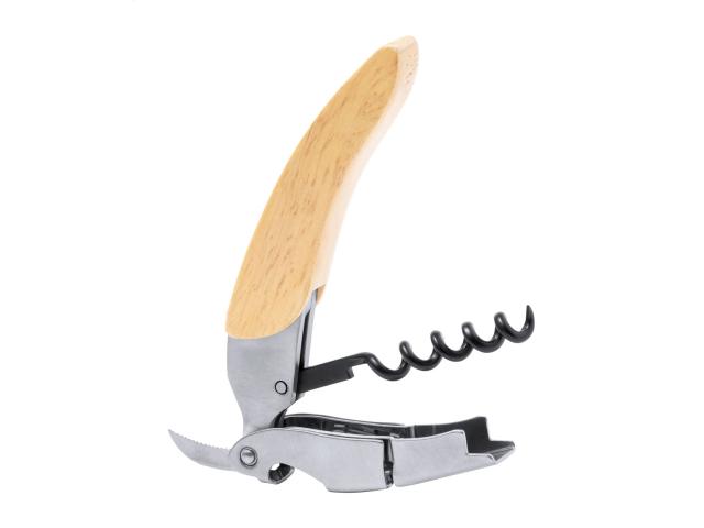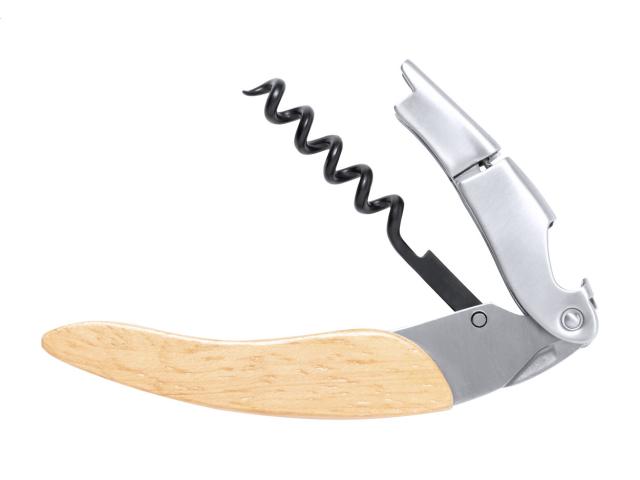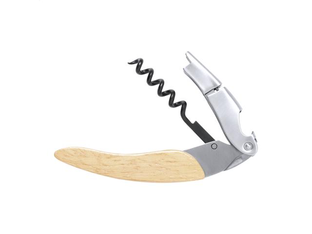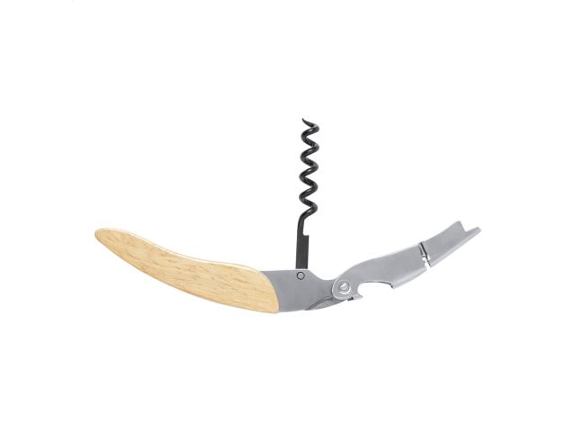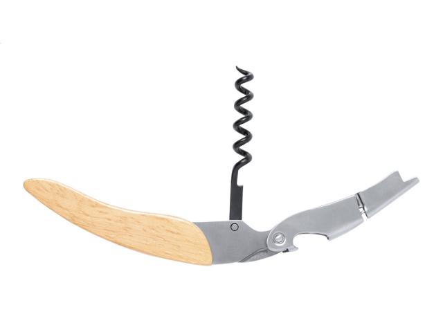 Stainless steel bottle opener and corkscrew with wooden handle.