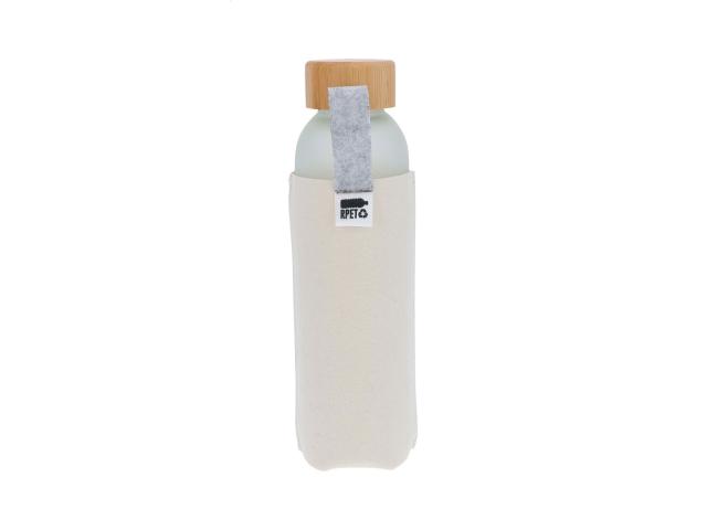 Glass bottle with bamboo cap in custom made, RPET felt pouch with full colour printed graphics and distinctive RPET label. Price includes sublimation printing. 500 ml. MOQ: 50 pcs. Not suitable for carbonated drinks.