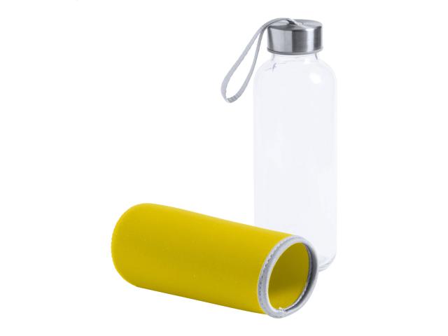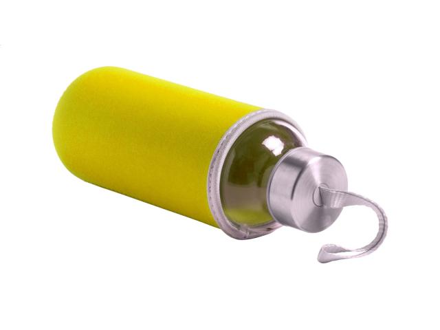 Glass bottle with carry strap on cap and coloured neoprene cover. 420 ml. Not suitable for carbonated drinks.