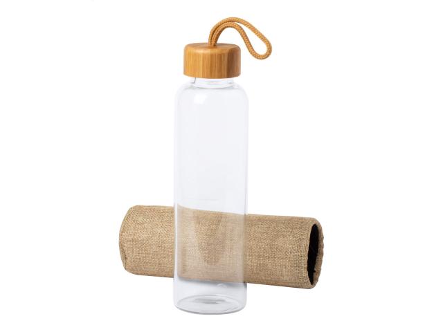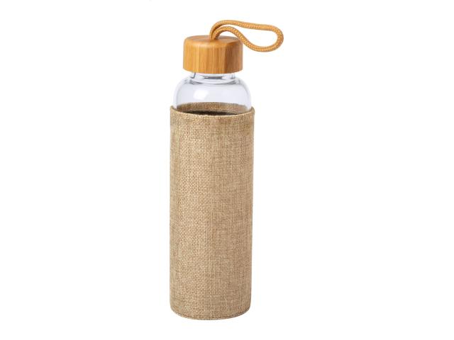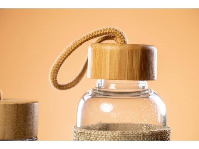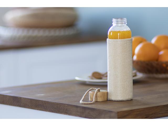Glass bottle with natural colour polyester sleeve, bamboo lid and carry strap, 500 ml. Not suitable for carbonated drinks.