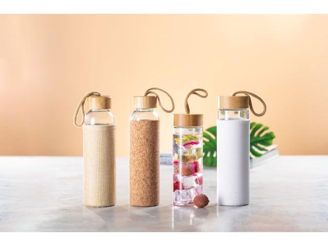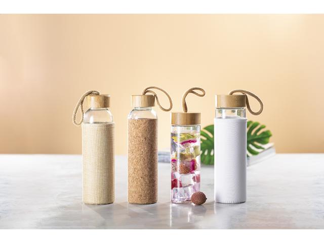 Glass bottle with natural cork sleeve, bamboo lid and carry strap, 500 ml. Not suitable for carbonated drinks.