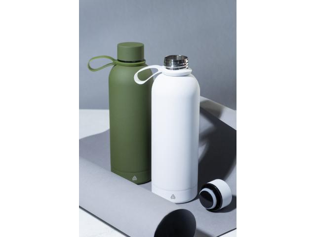 Double-wall, recycled stainless steel vacuum insulated bottle with rubberized finish and silicone carry handle, 500 ml.