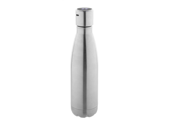 Double-wall, recycled stainless steel vacuum insulated bottle with LED touch thermometer on the lid. 500 ml. With built-in USB rechargeable battery. Including USB charger cable.