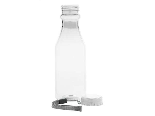 Transparent plastic sport bottle with screw-on cap and carry strap, 500 ml. Not suitable for carbonated drinks.