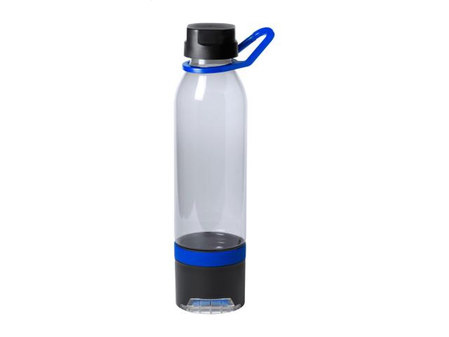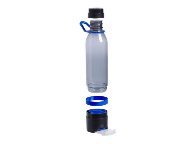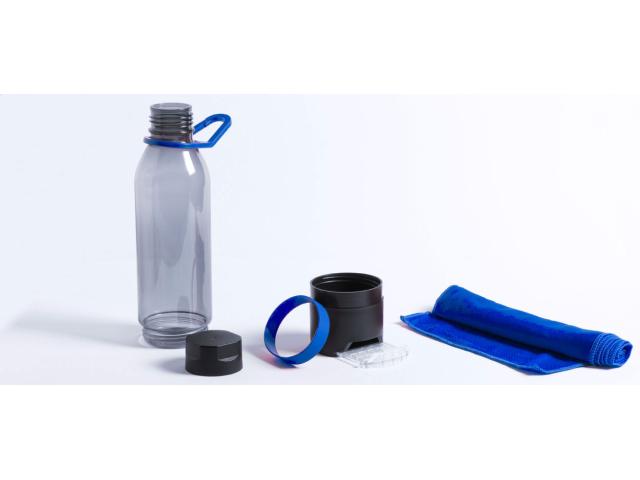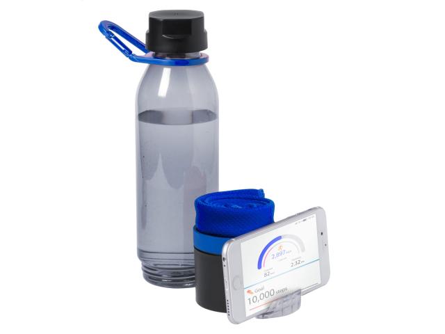 Plastic multifunction sport bottle with cooling towel (390 g/m²) in the bottom compartment and pull-out mobile phone holder. In gift box. 650 ml. Not suitable for carbonated drinks.
