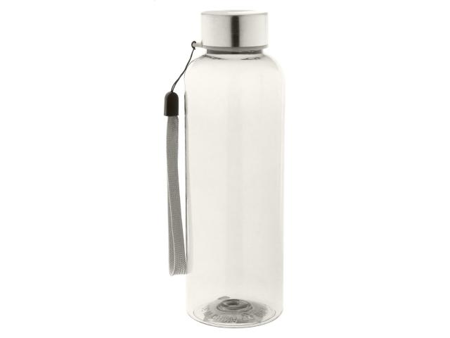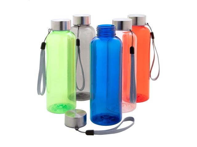 RPET bottle with stainless steel cap and carry strap, 500 ml. BPA-free. Not suitable for carbonated drinks.