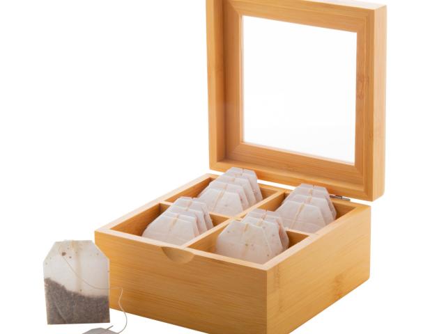 Bamboo tea storage box with transparent acrylic lid and 4 compartments.