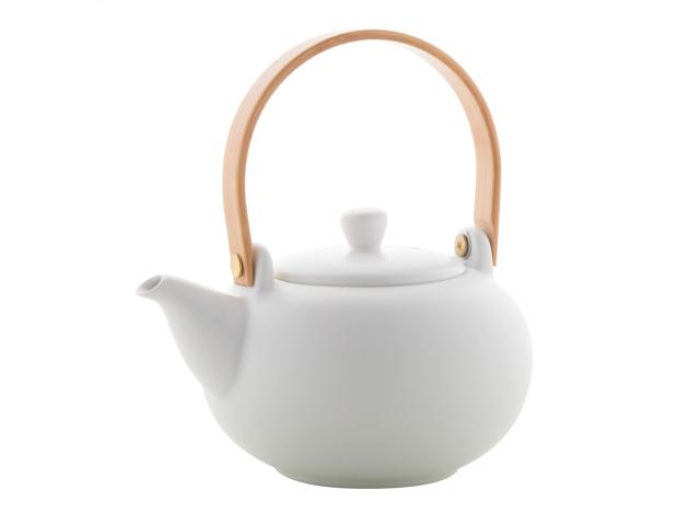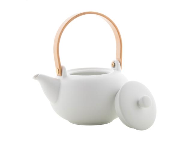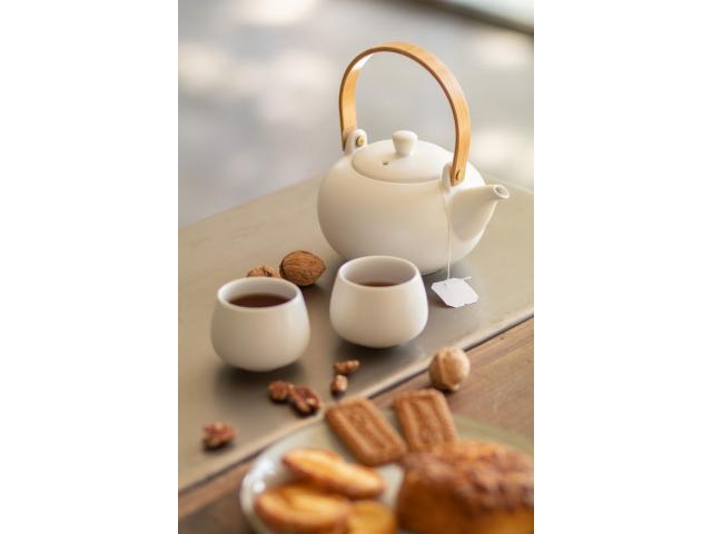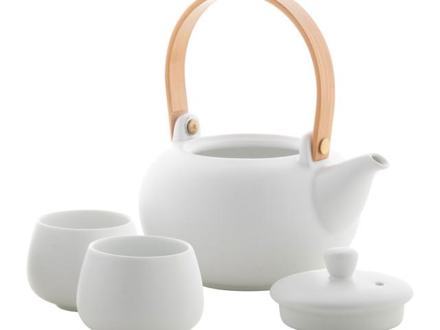 Ceramic tea set including a teapot with bamboo handle (600 ml) and two cups (110 ml). In kraft paper box.