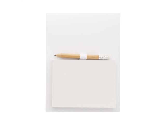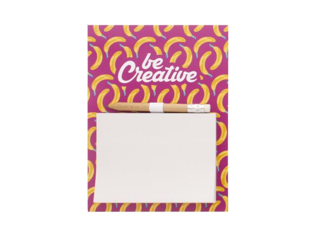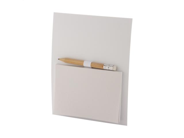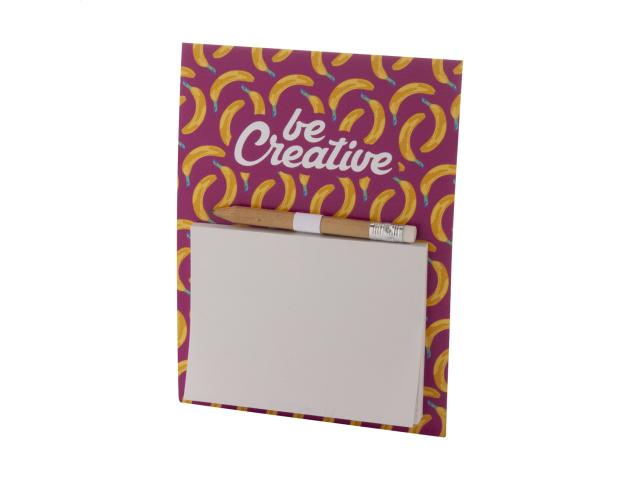 Custom made, full colour printed fridge magnet with sticky notepad and mini wooden pencil. Includes 50 sheets of recycled paper sticky notes (100×75 mm). MOQ: 100 pcs.